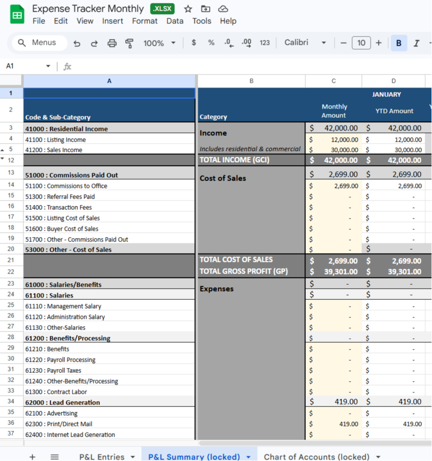 Stay organized and in control of your business finances with this simple profit and loss and expense tracking tool. Easily monitor income, track expenses, and understand your financial performance so you can make smarter business decisions. Perfect for agents who want clear insight into their monthly and yearly business growth.